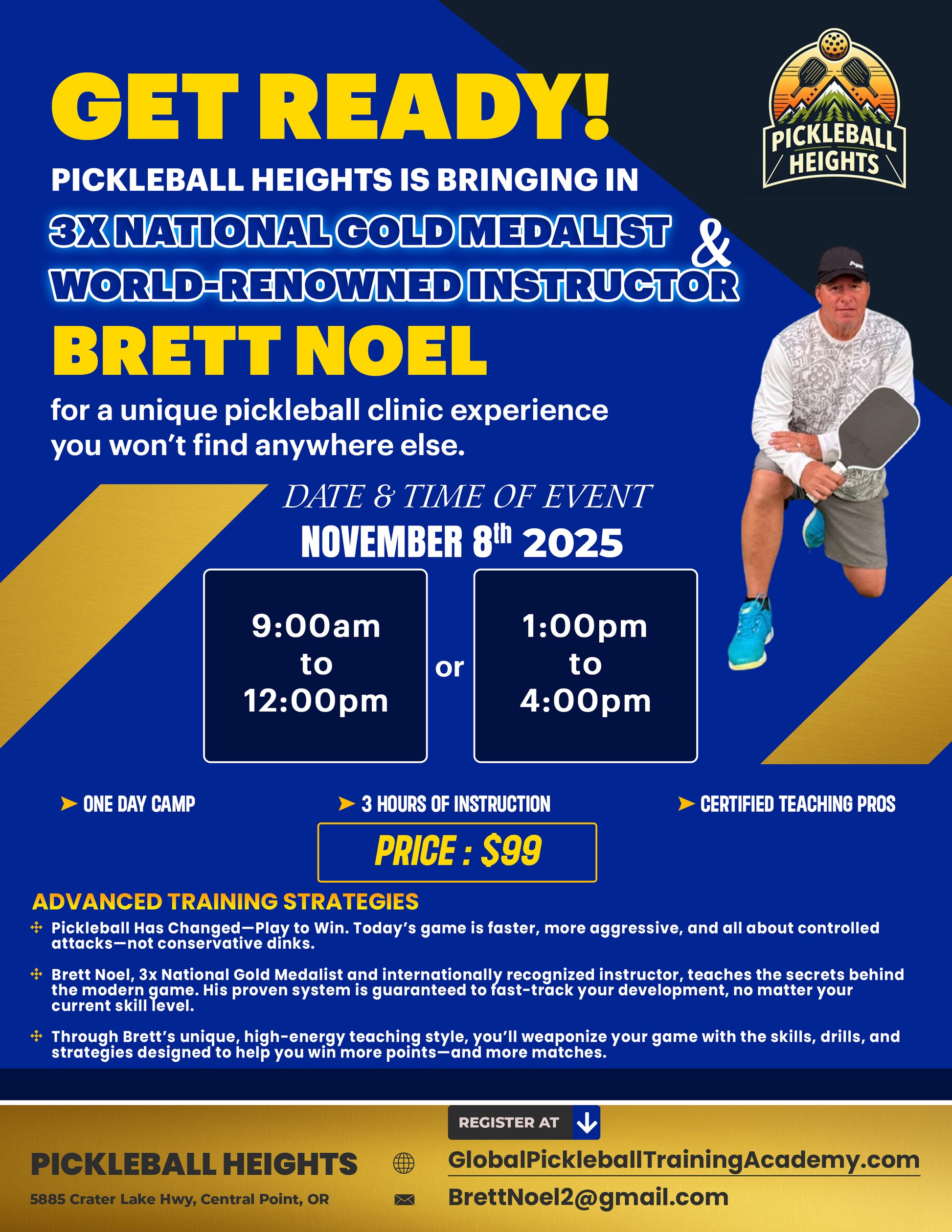 Join a 3-Hour Power Pickleball Clinic led by 3x National Gold Medal Winner Brett Noel—a session that will completely change how you see and play the game.