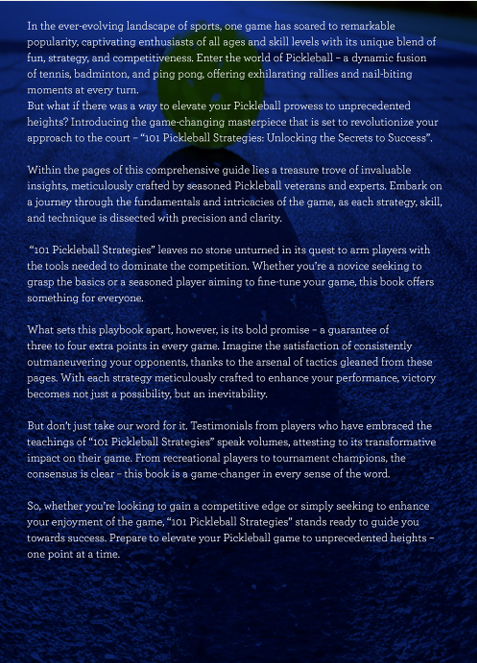 So, whether you're looking to gain a competitive edge or simply seeking to enhance your enjoyment of the game, "101 Pickleball Strategies" stands ready to guide you towards success. Prepare to elevate your Pickleball game to unprecedented heights – one point at a time.